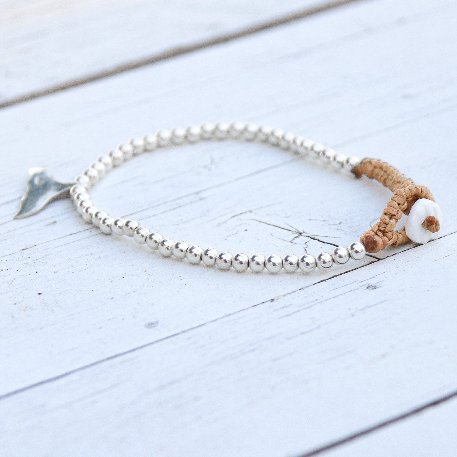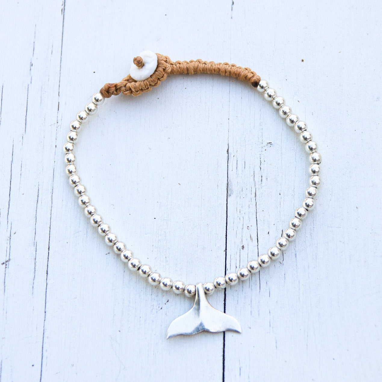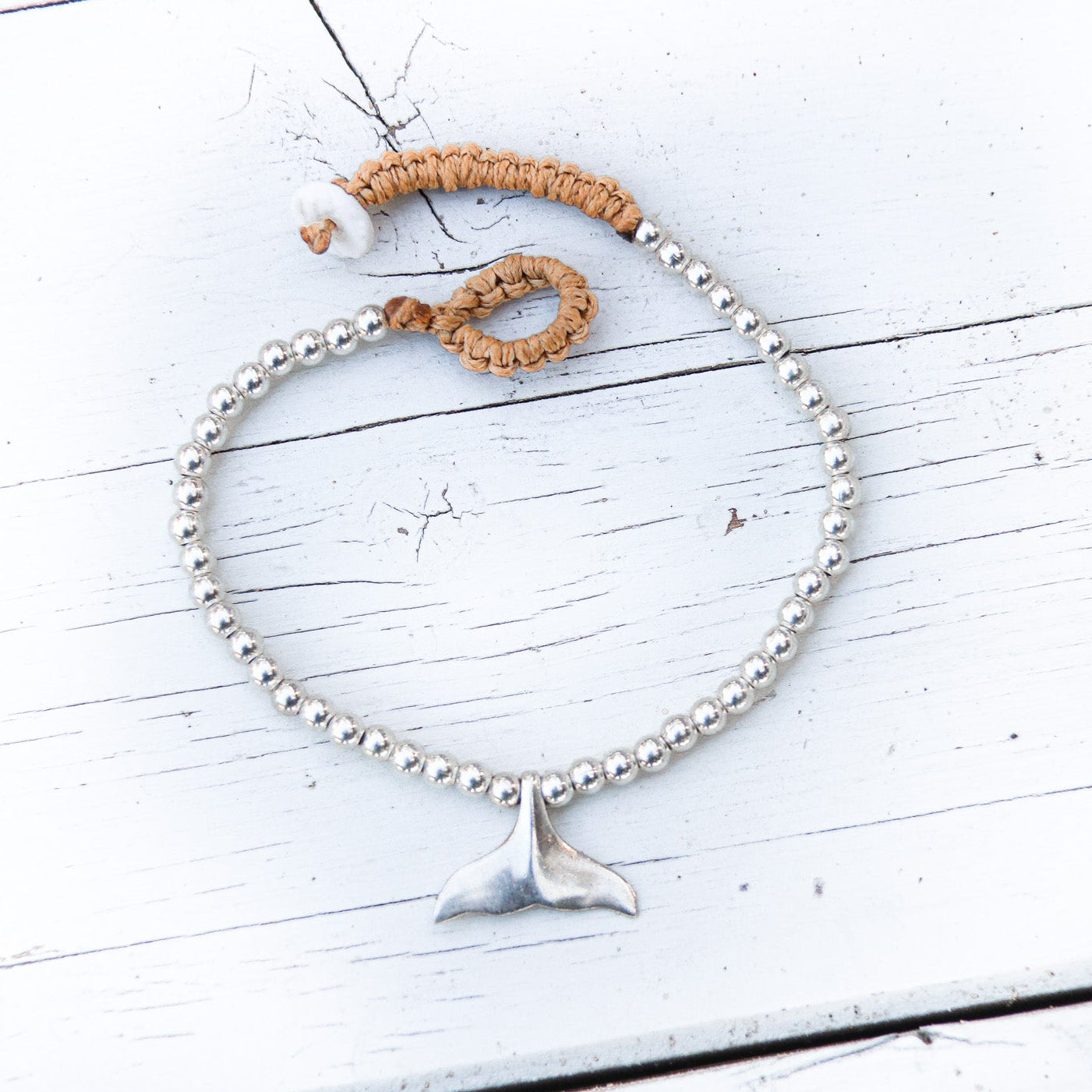 הצמיד עשוי חרוזי כסף סטרלינג 925, עם תליון זנב לווייתן מכסף סטרלינג 925 סמל עתיק לרוח שומר הדרך. השילוב בין הכסף הבוהק לבין הסמל הימי יוצר תכשיט שמגלם את מהות Kaiana: יציבות בתוך תנועה, שלווה בתוך כוח, וקשר עמוק בין האדם לים.
