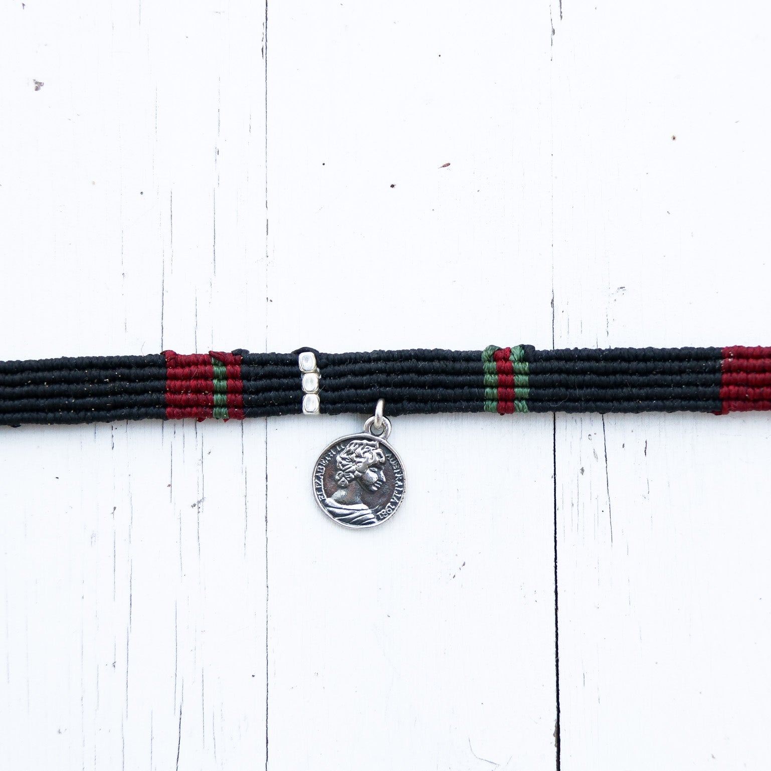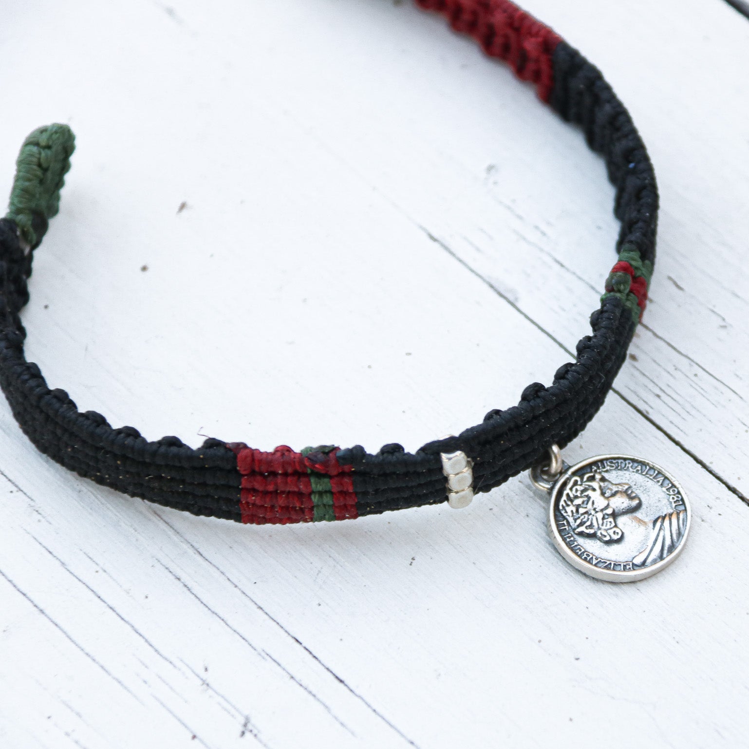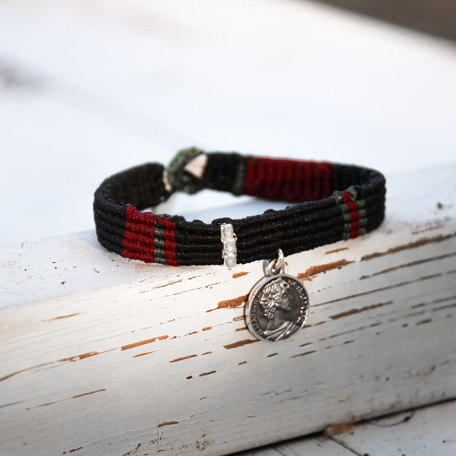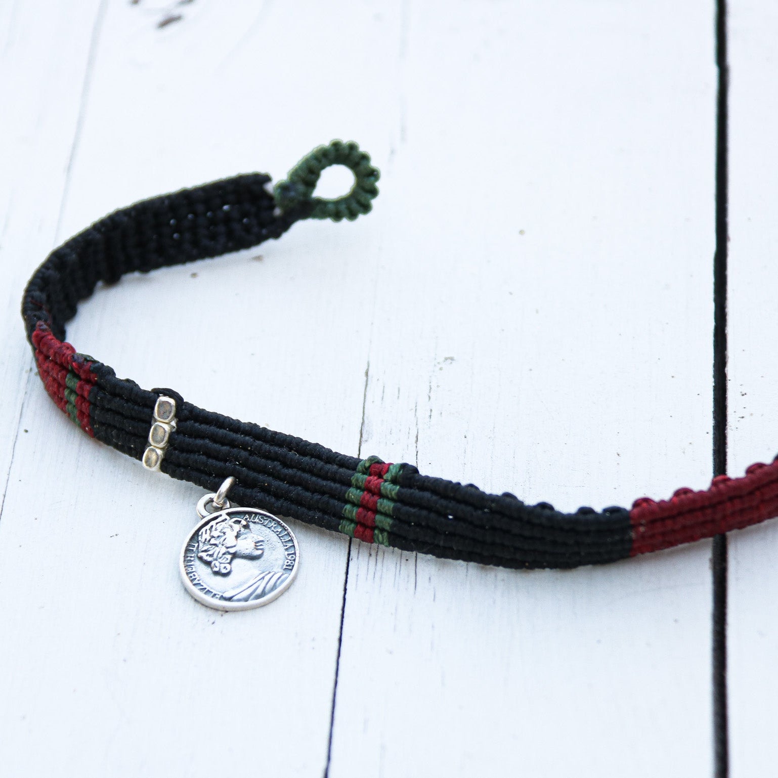 הצמיד עשוי בטכניקת שזירה ייחודית ועדינה, בגווני בורדו, ירוק זית ושחור צבעי האדמה של כרתים. שלושה חרוזי סטרלינג 925 ותליון יווני בעל דמות עתיקה משלימים את ההוויה המלכותית של כריתים העתיקה.