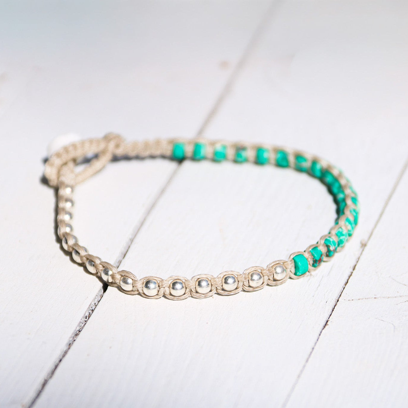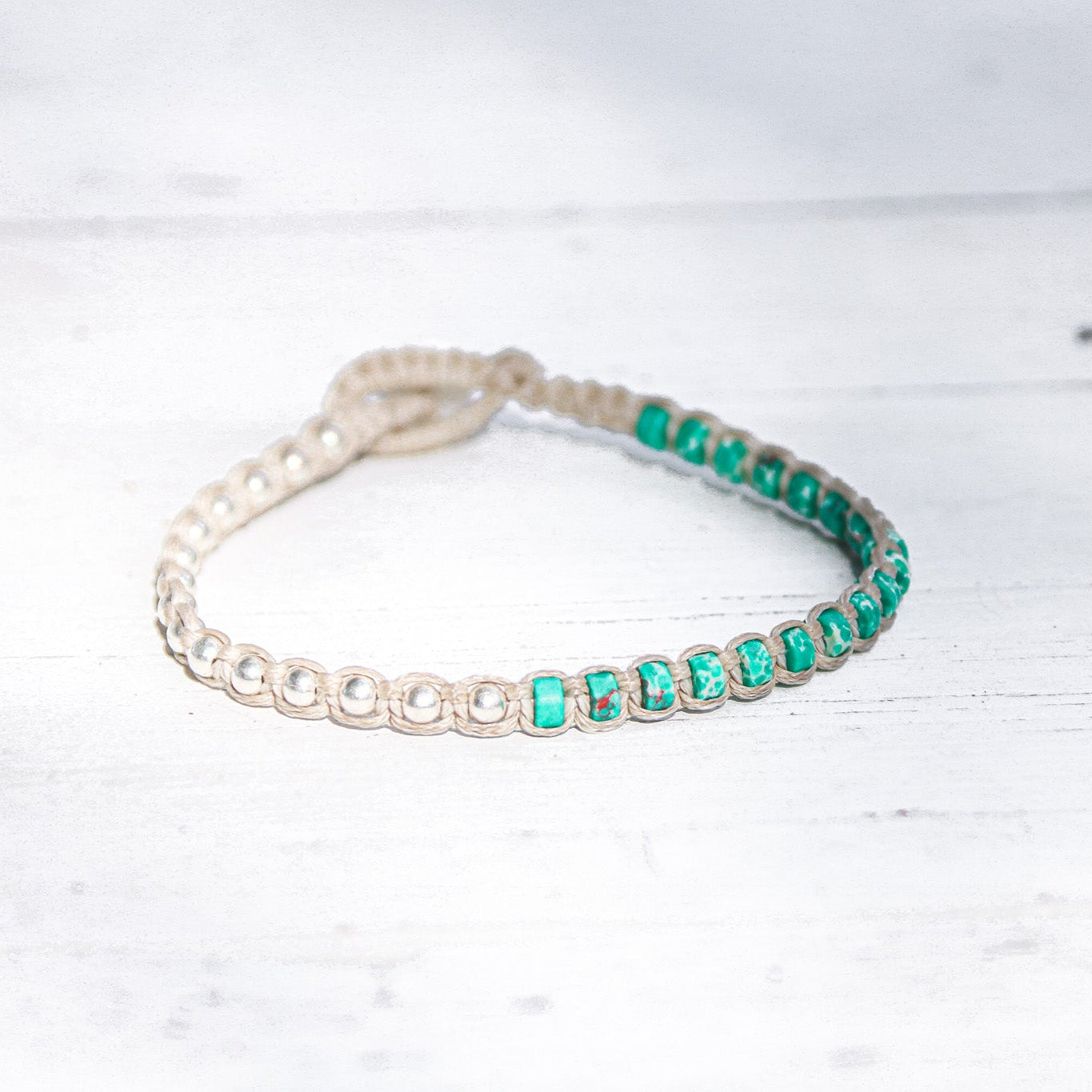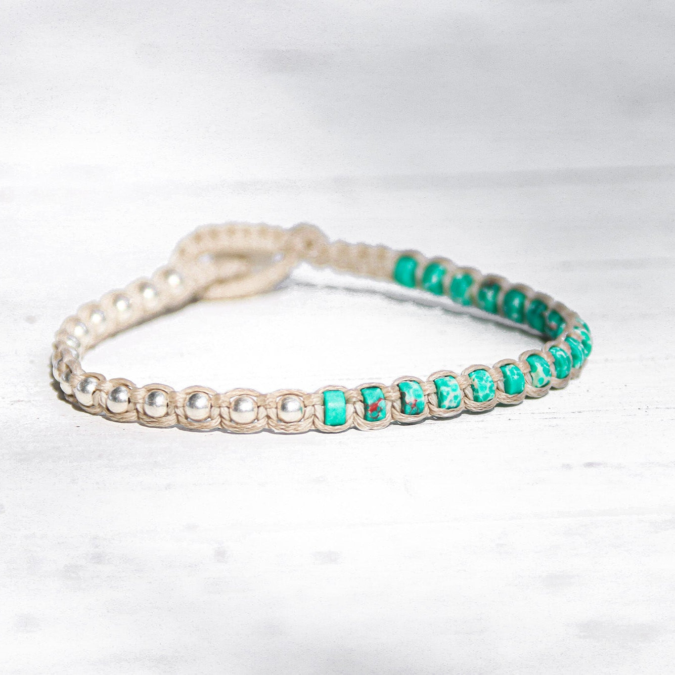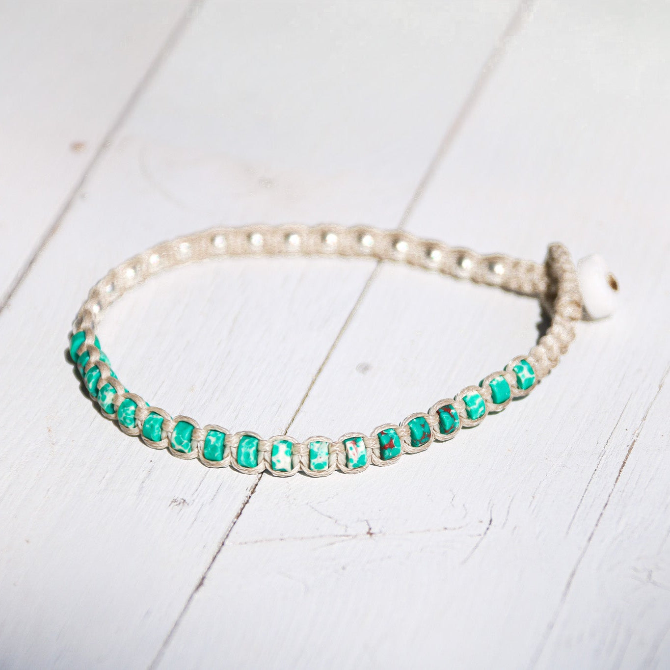 צמיד Santorini שוזר חרוזי כסף סטרלינג 925 ואבני Turquoise Style Howlite, חיבור בין אש למים, בין לובן האבן לעומק הים, תזכורת ליופי שנוצר כשעוצמה ושקט נפגשים.
