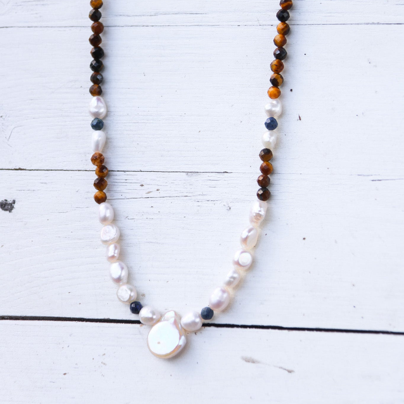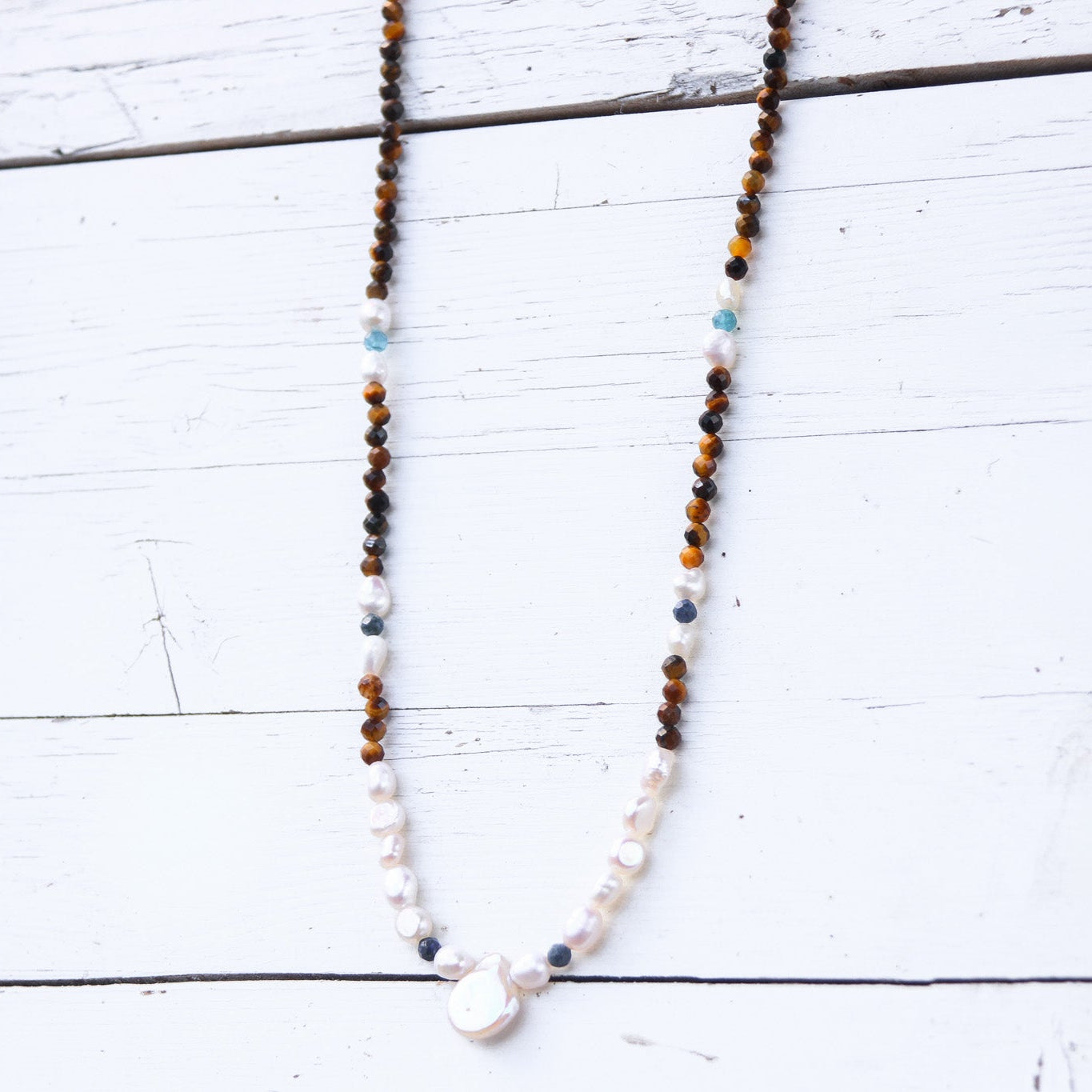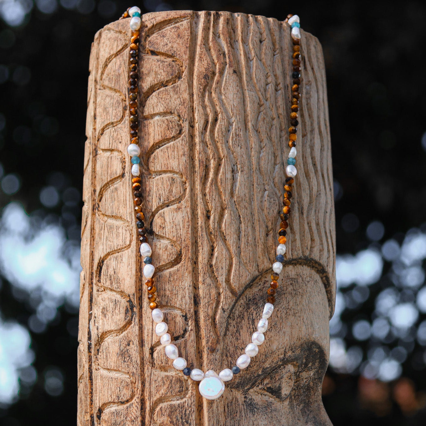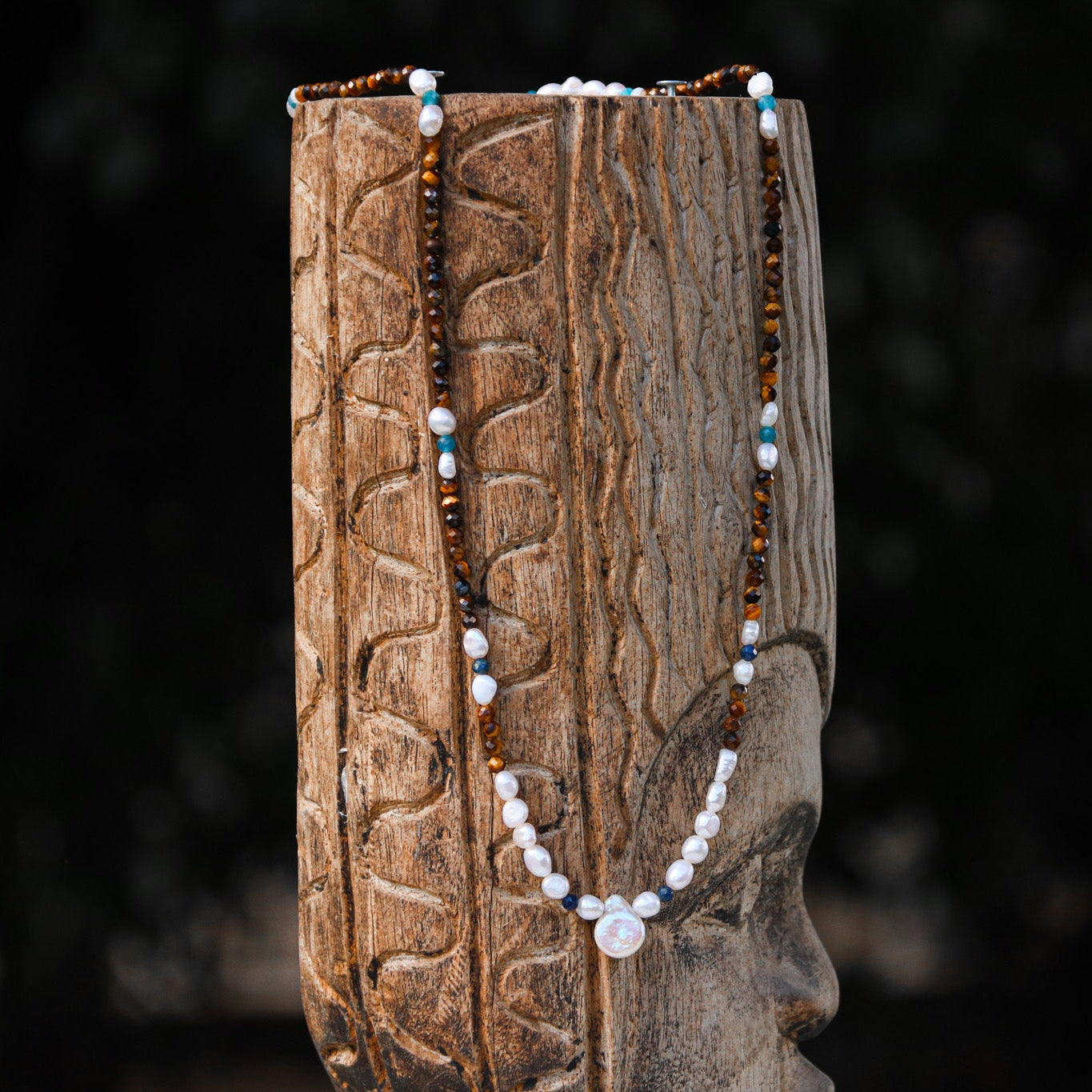 שרשרת Koa משלבת אבני עין הנמר, חרוזי זכוכית בגוון טורקיז ופנינים אמיתיות שילוב בין כוח ושקט, בין עומק הים לאור השמש. תזכורת שהחופש האמיתי מתחיל מבפנים.