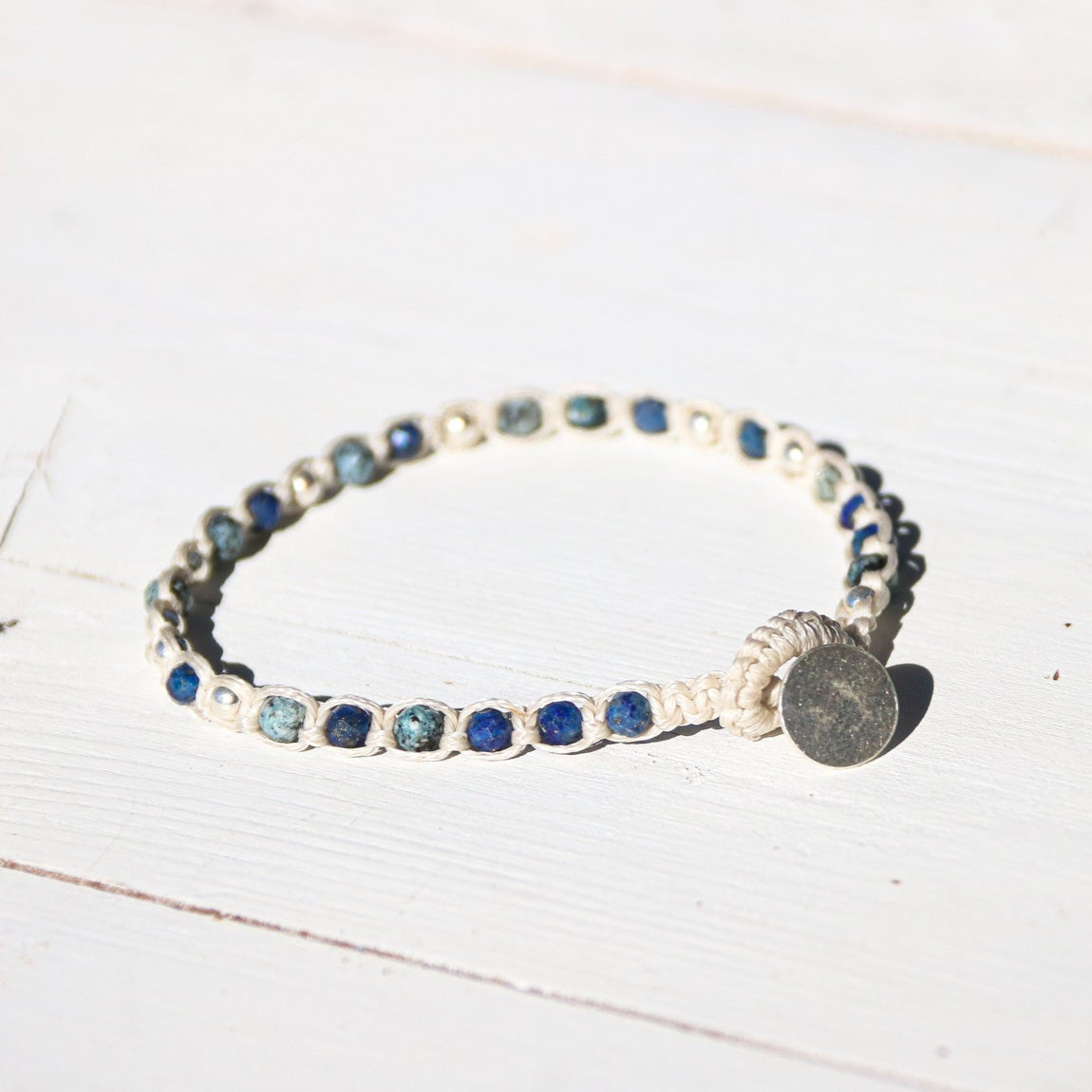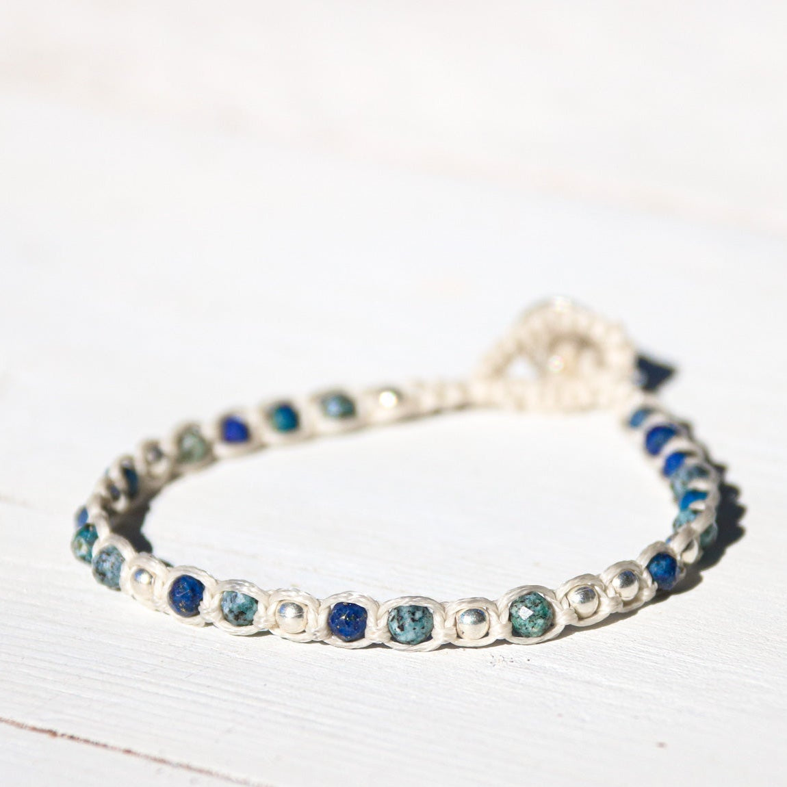 צמיד Byron עשוי African Turquoise (Jasper) וחרוזי אבן טבעית בגוון אבנים בגוון לאפיס לאזולי, שילוב שמזכיר את צבעי המפרץ ירוק־כחול של הים הפוגש את הכחול העמוק של השמיים, כמו רגע השקיעה מעל Cape Byron.