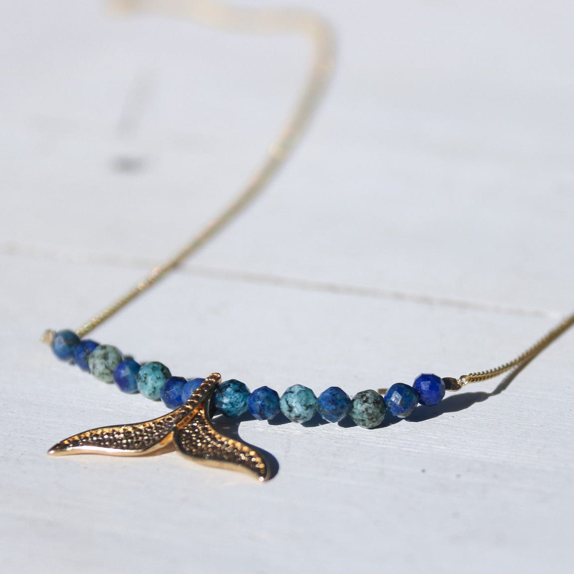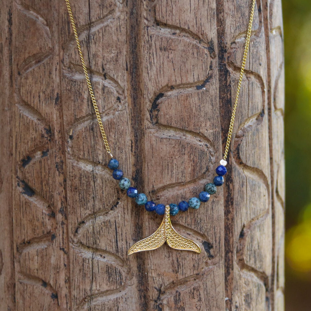 השרשרת עשויה, חרוזים בגווני לאפיס לאזולי וAfrican Turquoise (Jasper) מייצגים את המים העמוקים, ותליון זנב לוויתן מצופה זהב מחזיר אותנו לאותו סמל נצחי המפגש בין הים הפראי לבין חופש ועדינות אנושית.