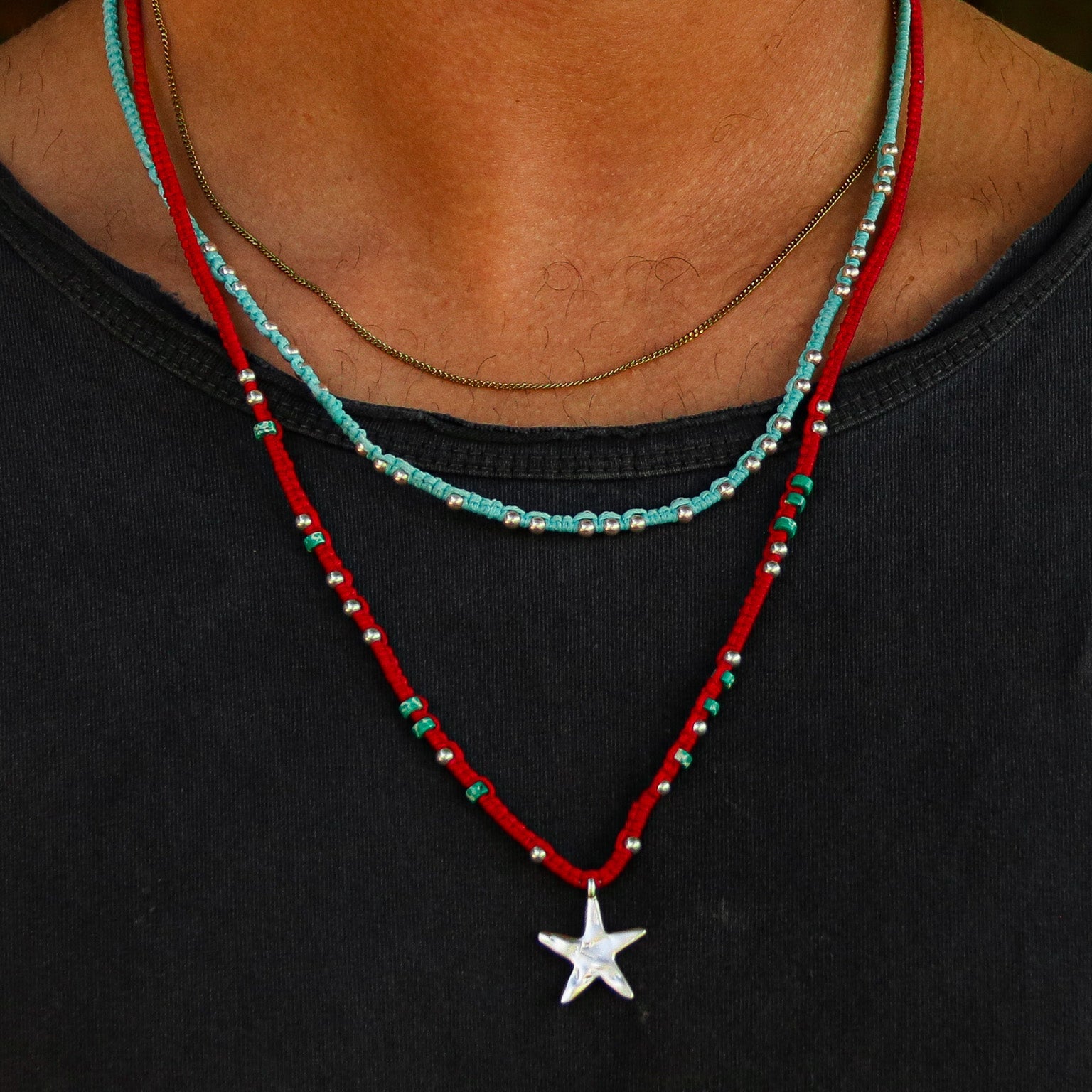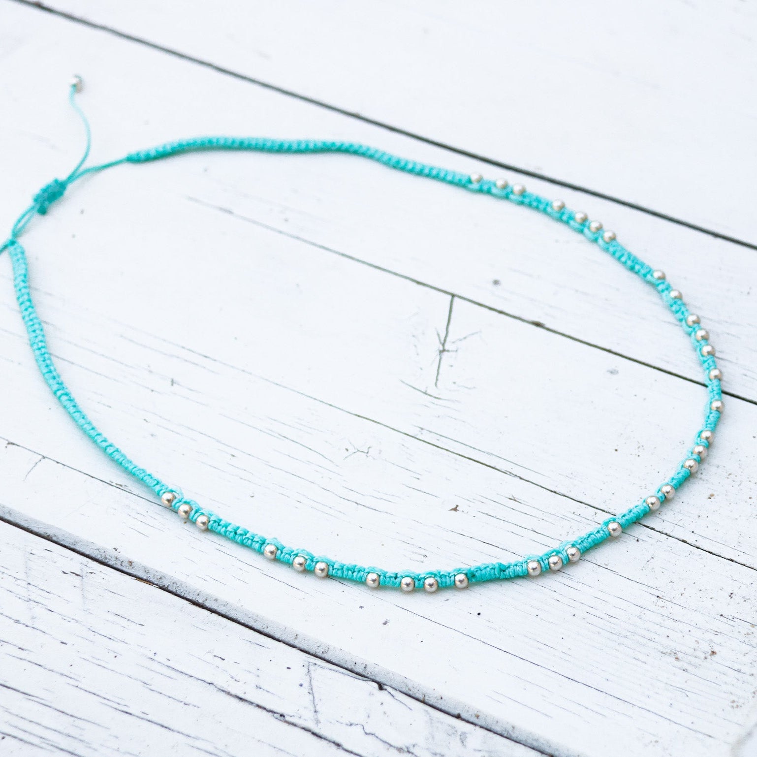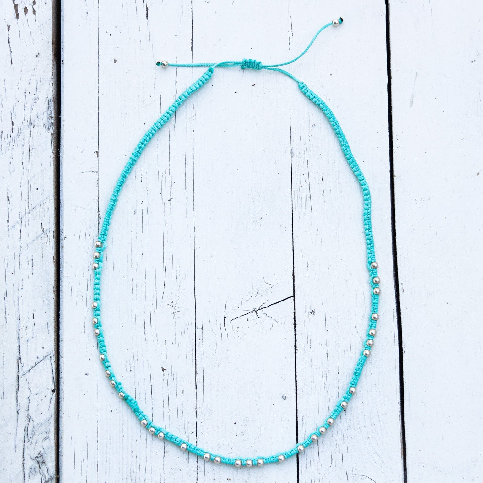 השרשרת עשויה מחרוזי כסף סטרלינג 925 השזורים בעבודת יד, המזכירים את הקשרים המסורתיים של דייגים ונוסעים ימיים. הכסף הטהור, בשילוב גווני התכלת, משחזר את הצבעים של ריף חי עולם תת־ימי מלא עושר, שקט ויופי טבעי.